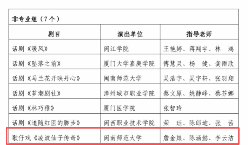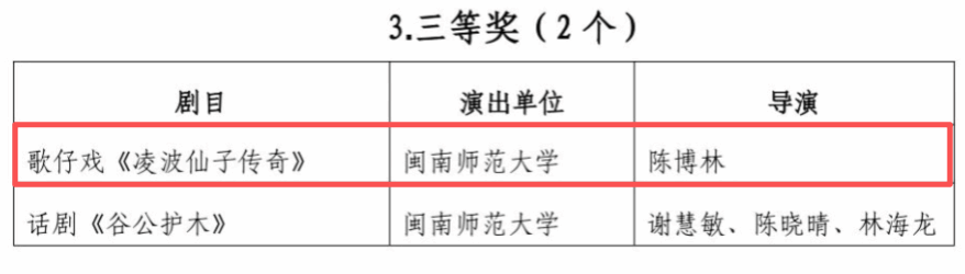 近日,由福建省文学艺术界联合会、福建省教育厅共同主办,福建省戏剧家协会承办的第六届福建省大学生戏剧节剧目展演评审结果正式揭晓,我院选送的作品《凌波仙子传奇》及多名学子获奖!