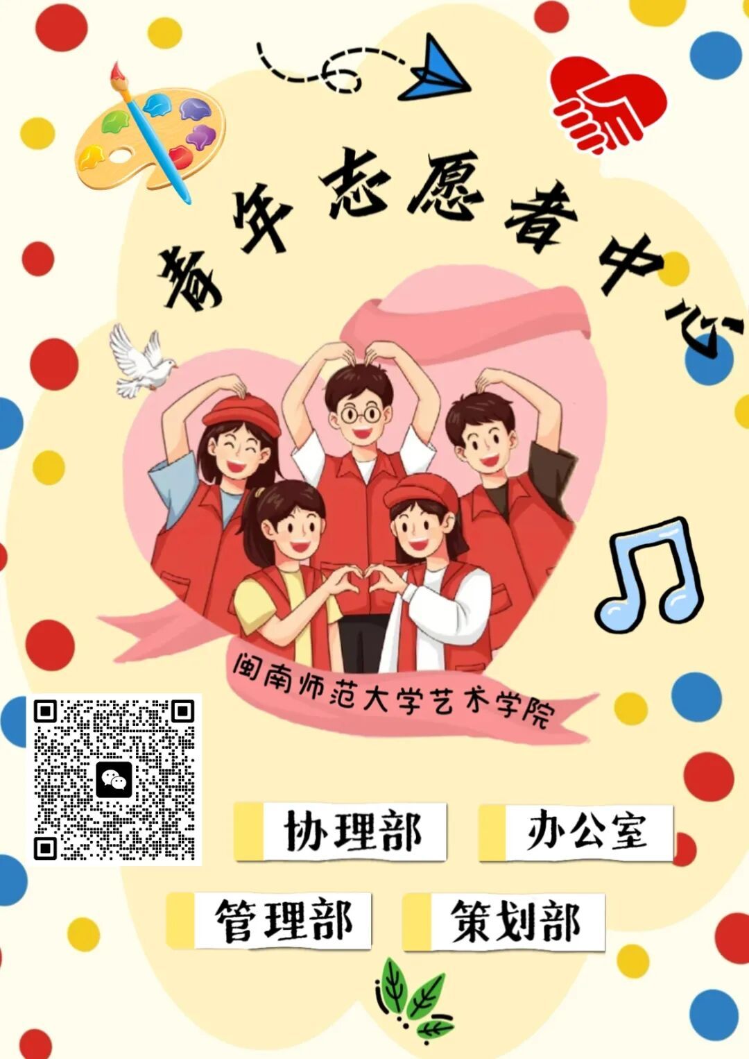 艺术学院青年志愿者中心(简称“院青志”),是由艺术学院志愿投身公益的青年组成。中心以“奉献、友爱、互助、进步”志愿精神为指引,汇聚爱心诚信、有信心毅力的同学形成温暖集体,为有志愿服务意向的学生搭建交流锻炼平台,创造服务奉献社会的机会。中心下设办公室、管理部、策划部、协理部,各部门紧密协作;成员兼具志愿者与学生干部身份,统筹校内外志愿服务。通过务实活动,既丰富学生生活、提升思想道德与实践能力,也在校内外传递爱心文明,助力和谐校园与社会建设,贡献青春力量,营造友善校园风尚。