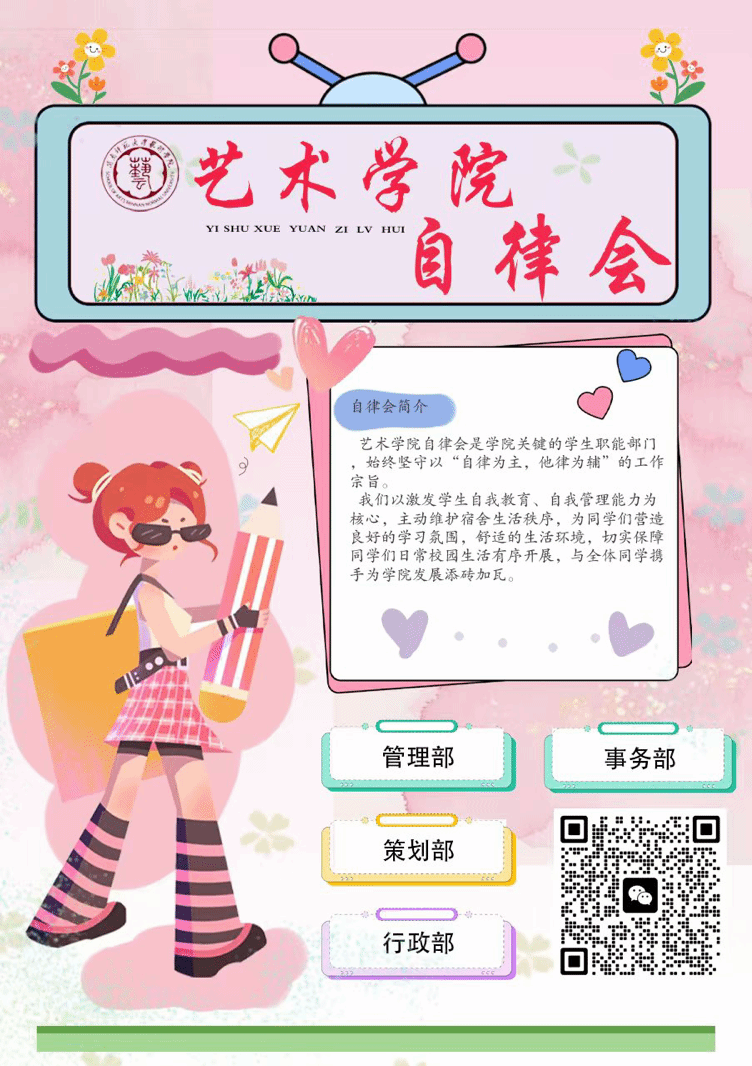 艺术学院自律会是学院关键的学生职能部门,始终坚守以"自律为主,他律为辅"的工作宗旨。我们以激发学生自我教育、自我管理能力为核心,主动维护宿舍生活秩序,为同学们营造良好的学习氛围,舒适的生活环境,切实保障同学们日常校园生活有序开展,与全体同学携手为学院发展添砖加瓦。