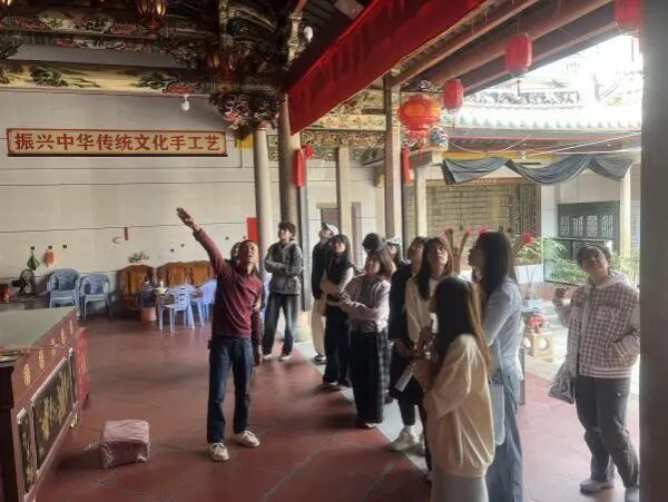 作为闽南文化璀璨瑰宝,诏安剪瓷雕以省级非遗的独特地位成为研学核心。在沈氏艺圃文德祖祠文化艺术馆,省级第五代传承人沈锡仁先生全程讲解,系统地向同学阐述剪瓷雕这一项独特工艺。剪瓷雕不仅色彩艳丽、造型生动,而且质感坚硬能抵御风雨侵蚀,题材多为祥瑞图案,如花卉、鸟兽等,体现闽南匠人高超技艺与坚韧文化精神。