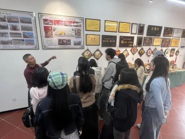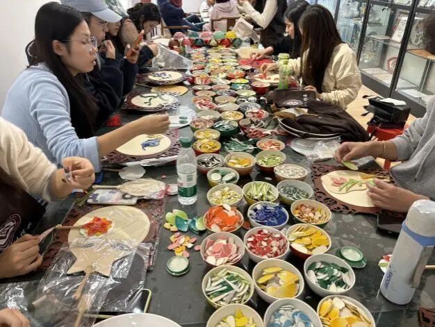 同学们沉浸式观摩珍品、记录工艺细节,亲身参与制作,从瓷片剪切到镶嵌拼接,在实操中体悟工艺精髓,深入思考“传统工艺材料创新”“非遗与现代美术教学融合”等专业问题,实现从“技艺体验”到“学术探究”的跨越。