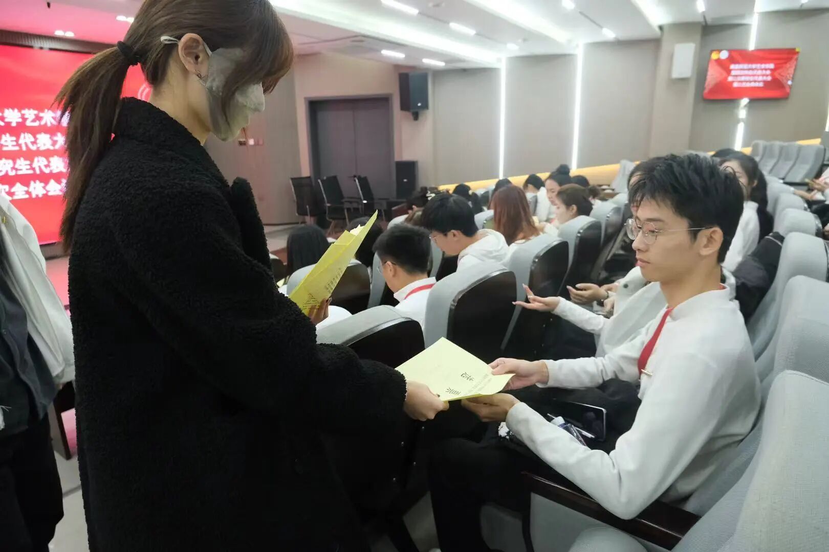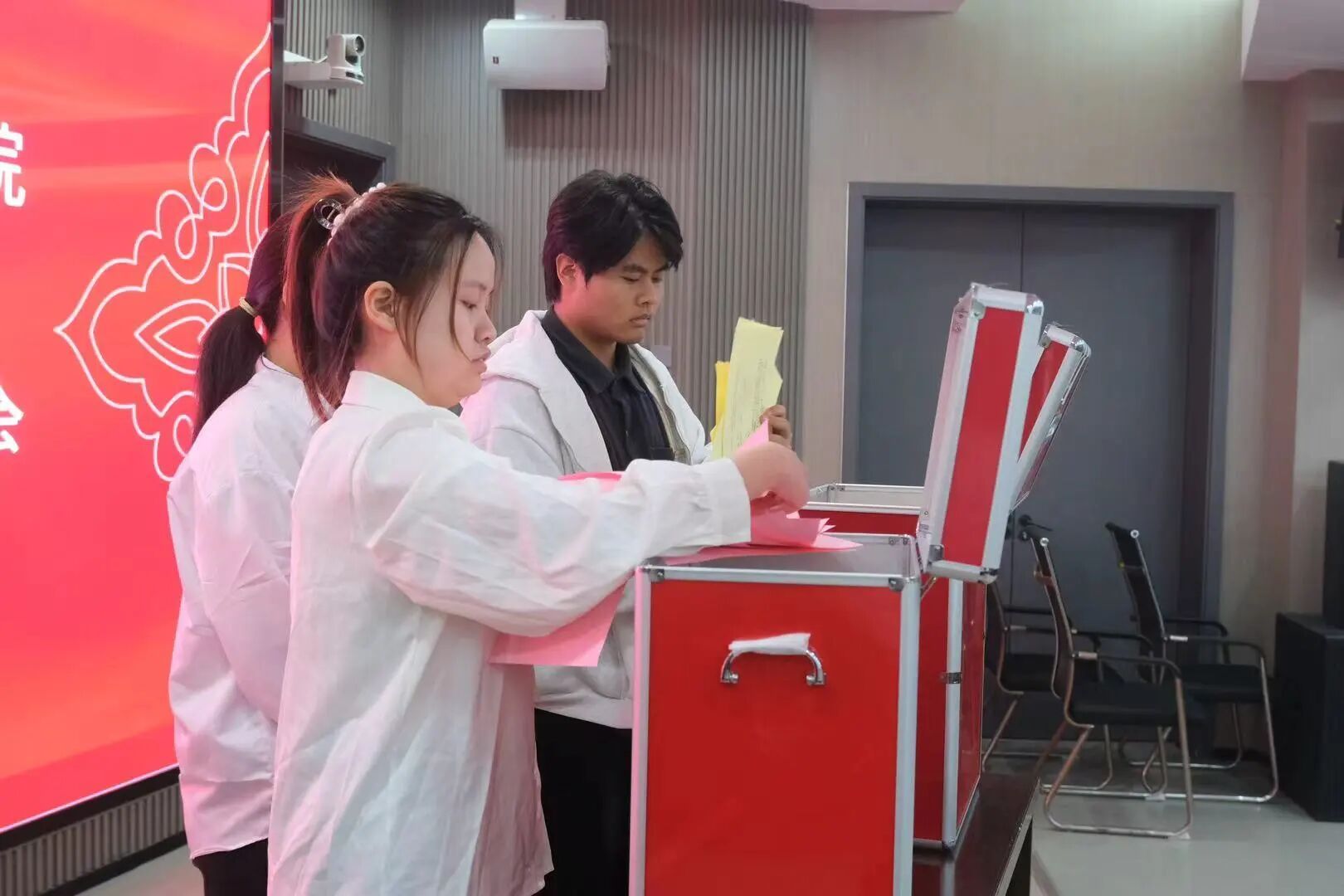 各代表团分组讨论后,大会召开第二次全体会议,听取各代表团汇报讨论情况,审议通过大会选举总监票人、监票人和总计票人、计票人建议名单及相关选举办法,选举产生闽南师范大学艺术学院第四届学生会主席团成员、第二届研究生会主席团成员。